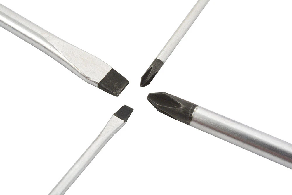 Le jeu de tournevis Pro à quatre pièces contient deux tournevis à fente et deux tournevis cruciformes – des outils indispensables de qualité d’atelier en acier au chrome-vanadium avec pointes brunies et poignées confortables en plastique caoutchouté.