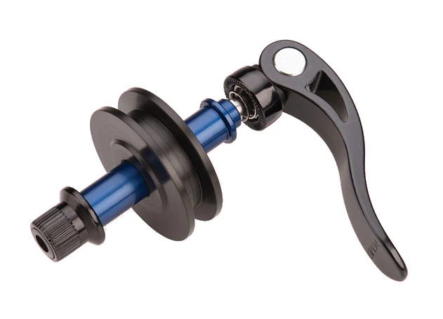 Le moyeu factice remplace la roue arrière, par exemple pour l’entretien de la chaîne et le transport du vélo, et est placé à cet effet sur le côté droit du triangle arrière.