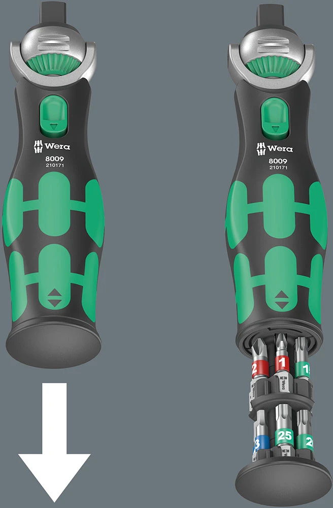 Le manche du cliquet compact Zyklop comprend une réserve captive pivotante pour 12 embouts (1/4″, 25 mm de long).
