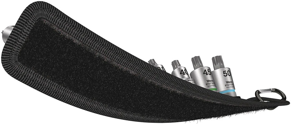 Sangle porte-outils en textile très résistant et design Wera, avec 9 douille-embouts, sur un espace réduit. Le mécanisme « Twist to Unlock », très souple, assure un maintien en toute sécurité et un retrait facile des douilles.